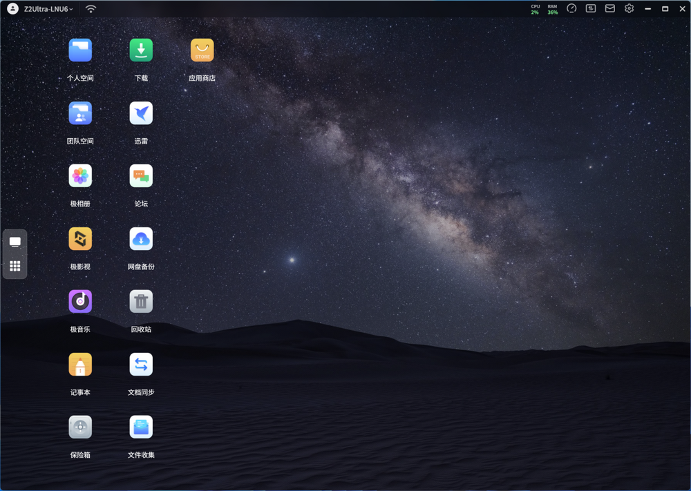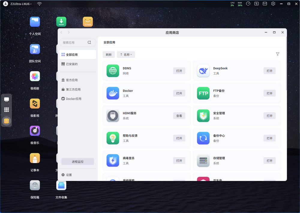 整个桌面客户端的操作界面可以说相当直观,它搭载了极空间ZOS 2.0系统,主要的功能基本都在,点开更多按钮则可以查看全部应用,点看应用商店则可以安装包括官方应用、第三方应用,以及Docker应用还有虚拟机功能。而且很多NAS配置十分复杂,极空间的ZOS这种图形化的系统对于新手小白来说十分便捷,整体排布和我们日常使用的Windows电脑基本没什么太大区别。