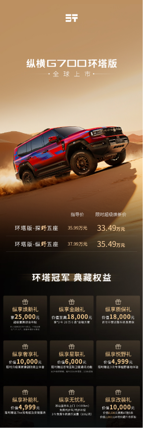 纵横G700环塔版共推出2个版型,限时超级焕新价33.49万元—35.49万元,更有九重上市专属购车权益,旨在为用户提供从购车、用车到玩车的全链路尊享体验。