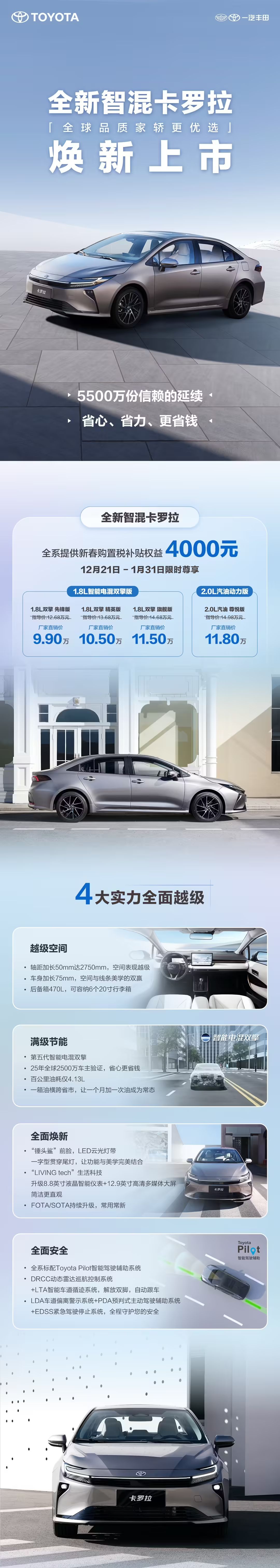 中期改款的一汽丰田卡罗拉 21 日上市,共推出 4 款配置车型,官方售价区间为 12.68 - 14.98 万元,厂家直销价为 9.90 - 11.80 万元。