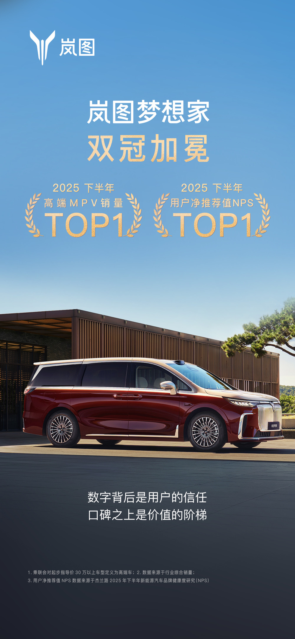 1月10日数据显示,岚图梦想家在2025年下半年销量为43191台,再次蝉联高端MPV第一,2025全年达到80248台,同比增长46%。另据杰兰路发布的《2025年度下半年新能源汽车品牌健康度研究(NPS篇)》,岚图梦想家在2025年下半年以78.5分的净推荐值(NPS)位居新能源MPV榜首。作为豪华旗舰MPV,岚图梦想家在2024年、2025年连续蝉联MPV用户净推荐值第一,成为销量与口碑的“双料冠军”,持续引领中国高端MPV。