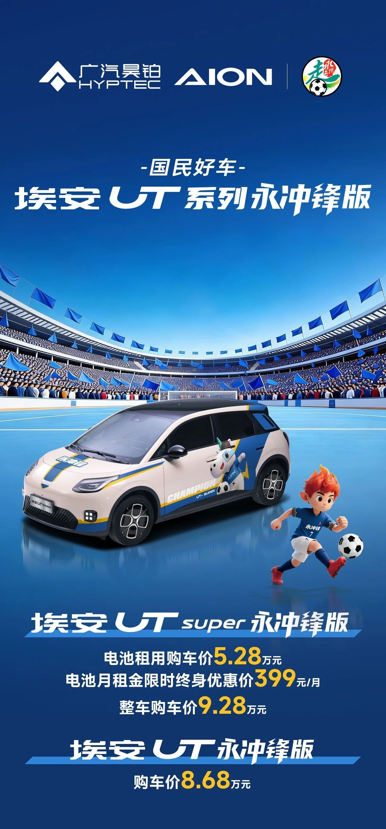 广汽集团宣布旗下埃安 UT 永冲锋版系列车型正式上市,其中“永冲锋版”售价 8.68 万元;而 Super 永冲锋版售 9.28 万元,该版本车型电池租用方式购车价为 5.28 万元,电池月租金限时终身优惠价 399 元 / 月。
