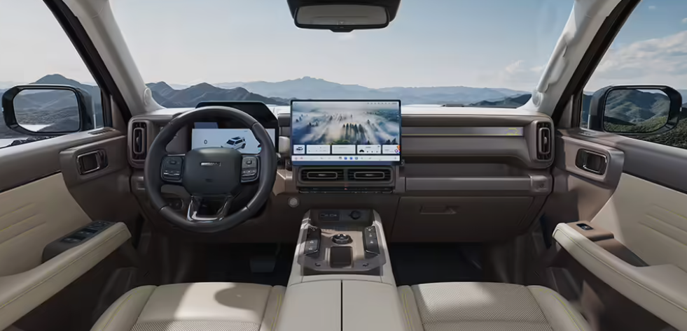 越野方面,车辆配备后桥电控机械牙嵌式差速锁,支持蠕行模式和坦克转弯功能,空载最小离地间隙 221 毫米,最大涉水深度 580 毫米,最大爬坡度不低于 60%。底盘采用前麦弗逊、后多连杆独立悬架,并配备电控减振器。