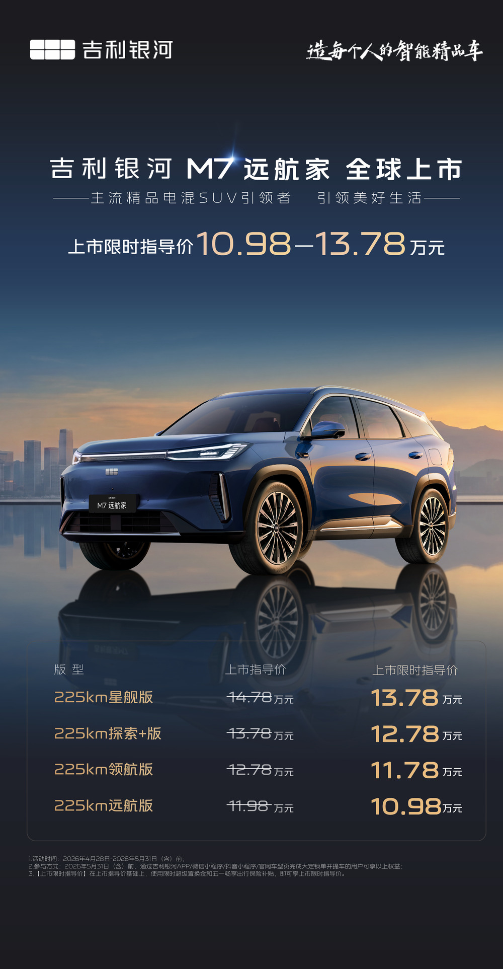 4月28日,“主流精品电混SUV引领者”吉利银河M7远航家正式上市,全系标配长续航225公里。新车共推出4个版型,分别是225km远航版、225km领航版、225km探索+版和225km星舰版,上市限时指导价为10.98万元-13.78万元。